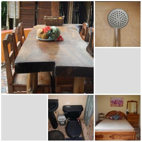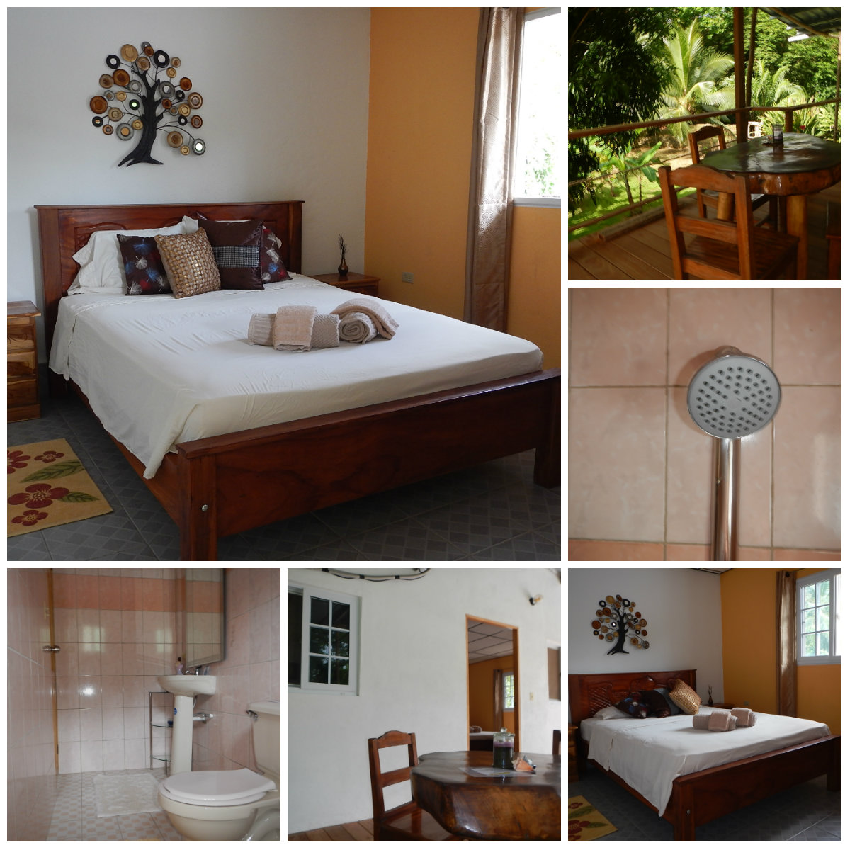 Decorated in browns and beige, this bright corner suite has a bathroom with shower, fan and orthopedic mattress. Prepare a meal in the communal kitchen to enjoy on your own hand hewn table on our balcony and watch the monkeys play.