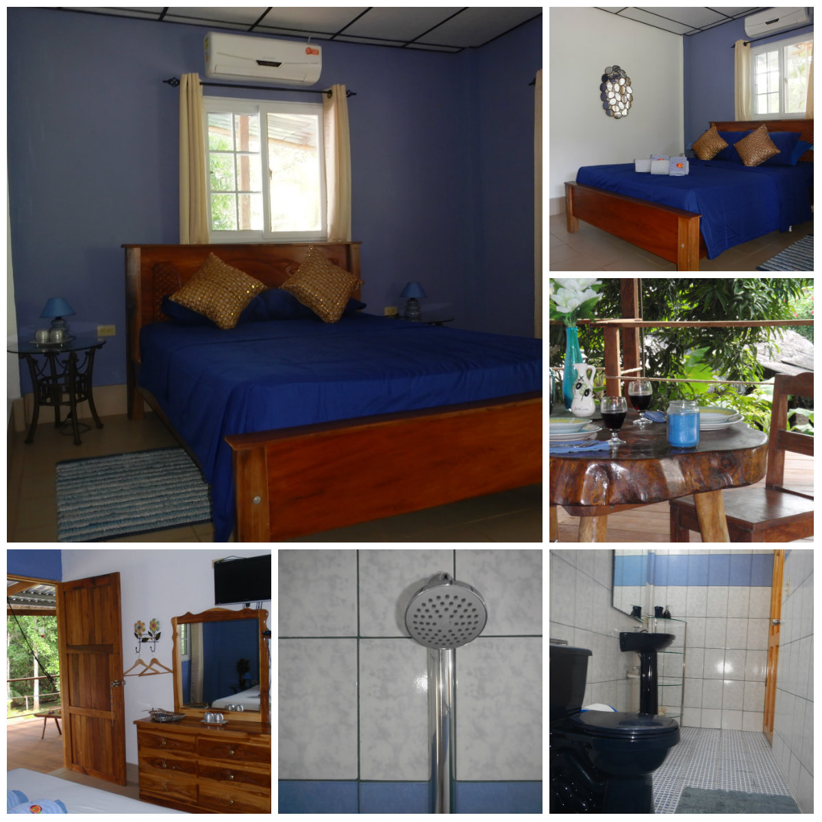 Decorated in cool blues this room has its own bathroom with shower, air conditioning, flat screen TV and orthopedic mattress. Step out of your room onto our covered balcony and relax in a hammock overlooking the jungle and river.