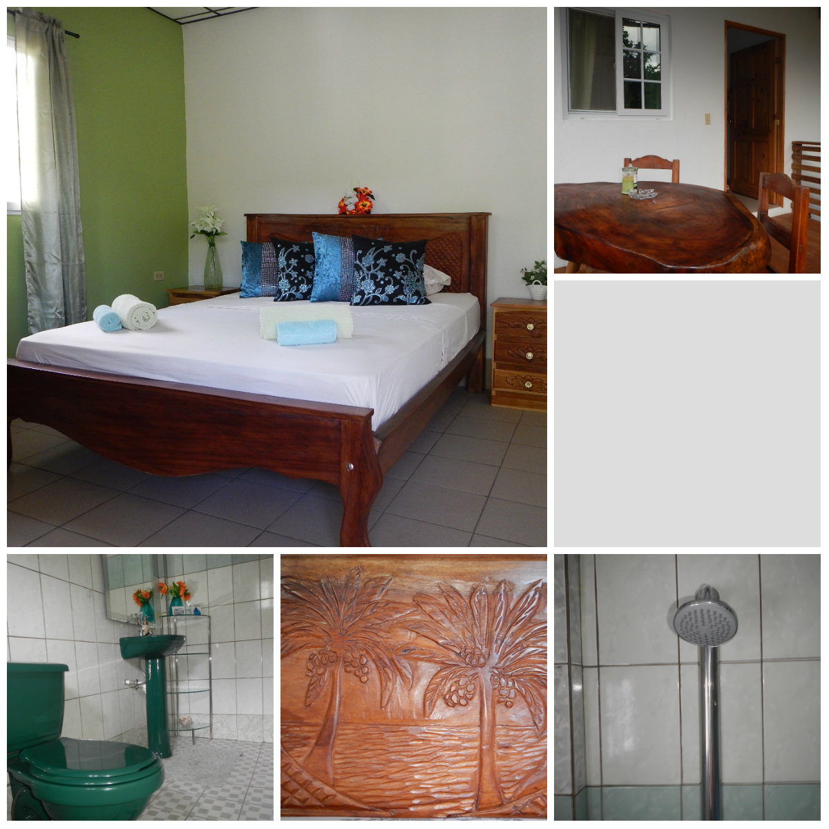 Decorated in lush greens, this bright corner suite has a bathroom with shower, fan and orthopedic mattress. Step out of your room onto our covered balcony and enjoy one of our breakfasts while watching the hummingbirds feed.